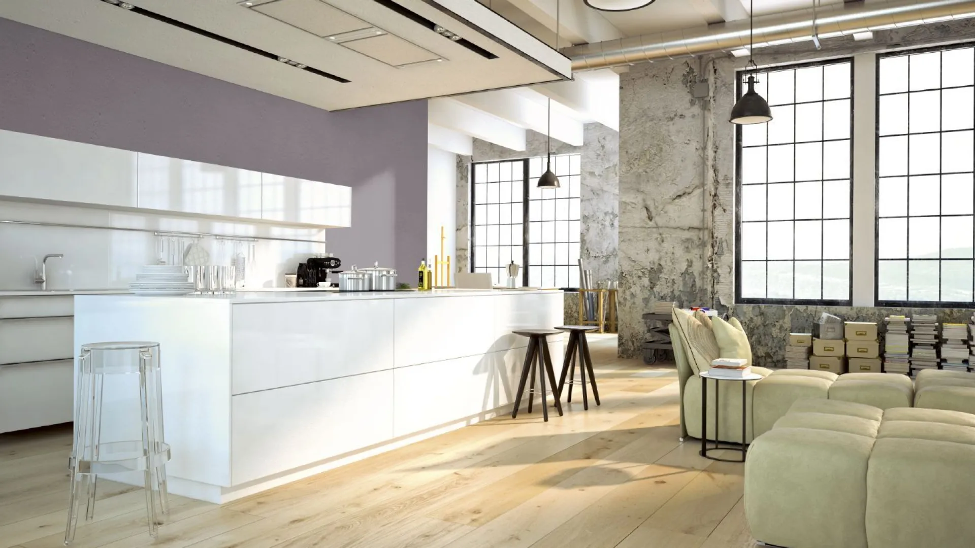 Pokój pomalowany w chłodnym ciemnym odcieniu szarości, takim jak Mountain Charm, będzie wydawał się mniejszy, ale też przytulniejszy. Jeżeli nie chcemy uzyskać pomieszczenia zbyt ciemnego, dobrym rozwiązaniem będzie połączenie tego koloru z bielą lub jasną szarością np. Light Grey lub Silver Pearl. Dla ocieplenia typowego dla wnętrz loftowych zestawienia szarości na podłodze warto zastosować naturalne drewno.